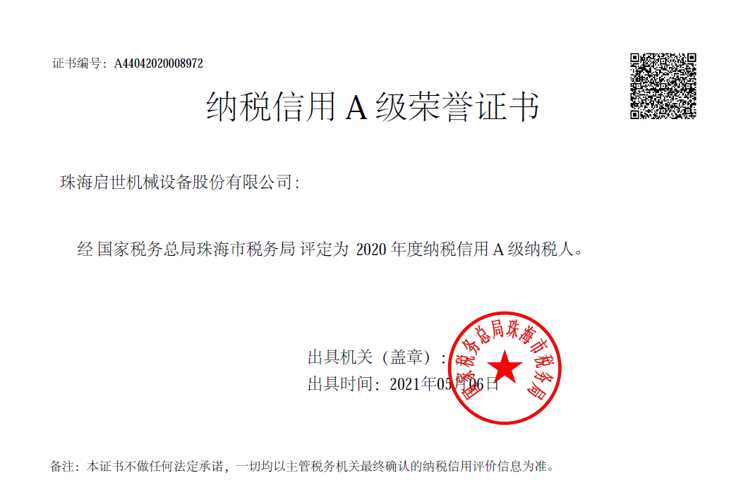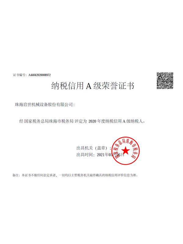 納稅信用A級榮譽(yù)證書