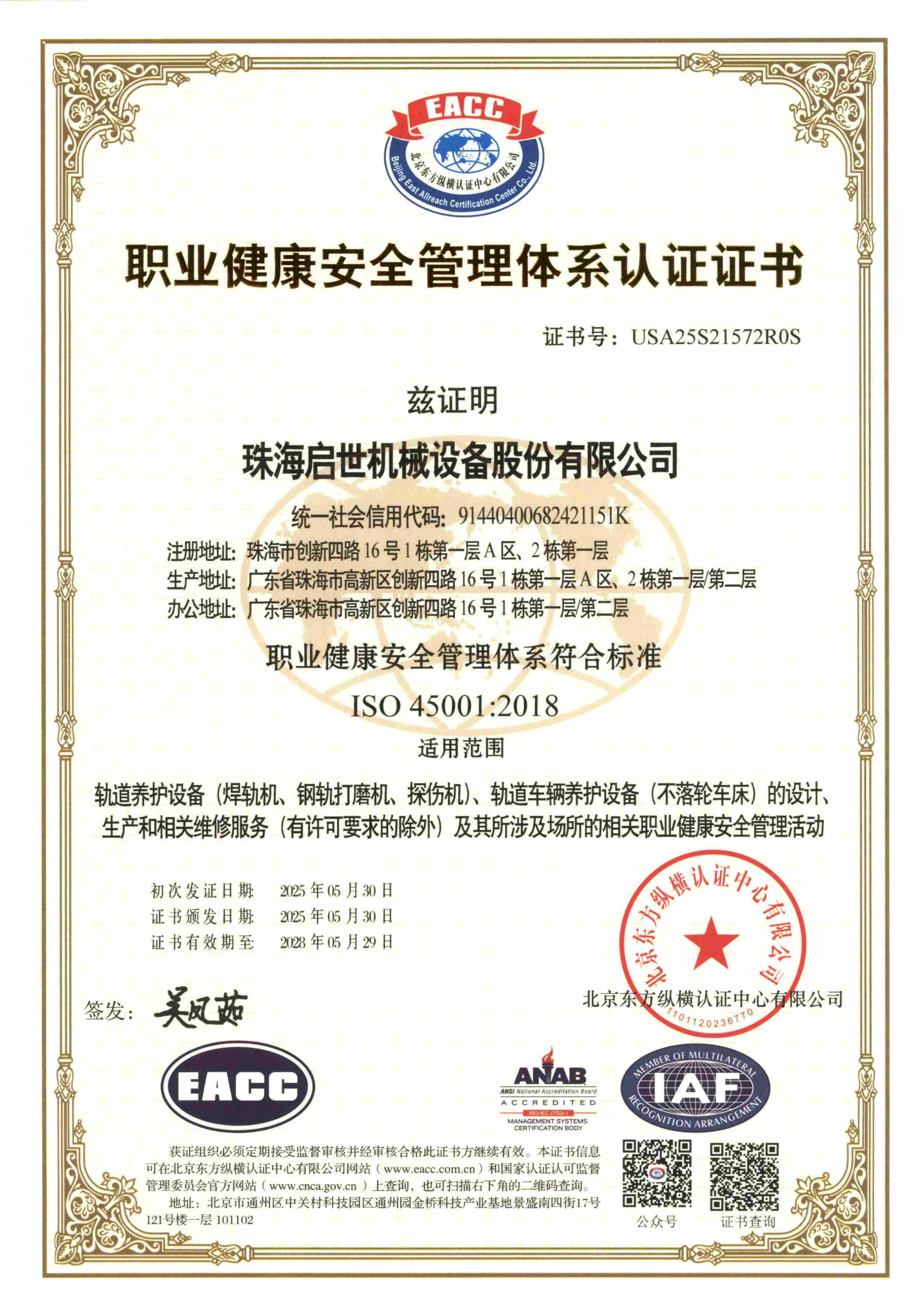 職業(yè)健康安全管理體系證書